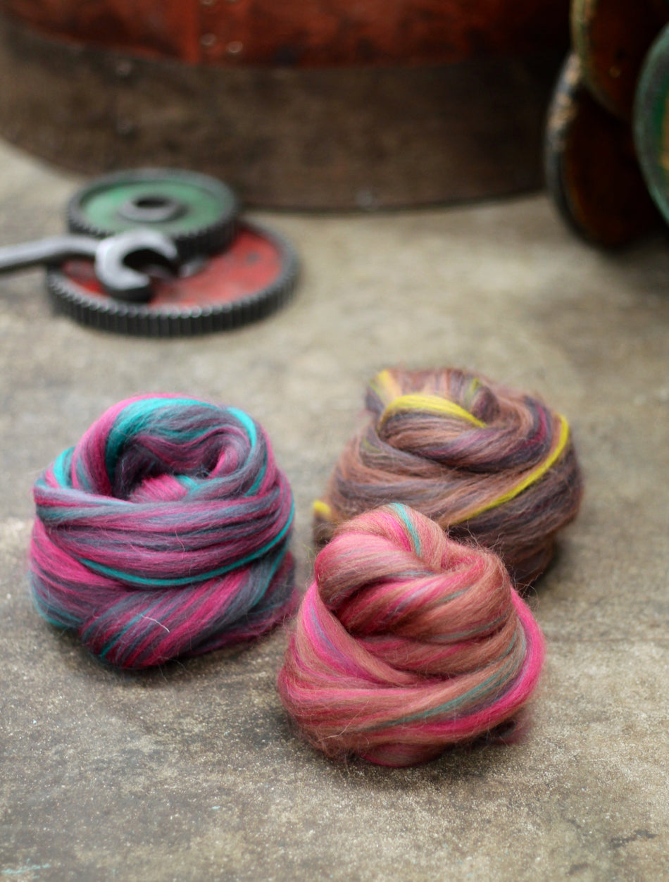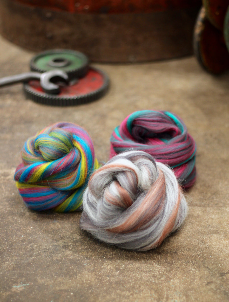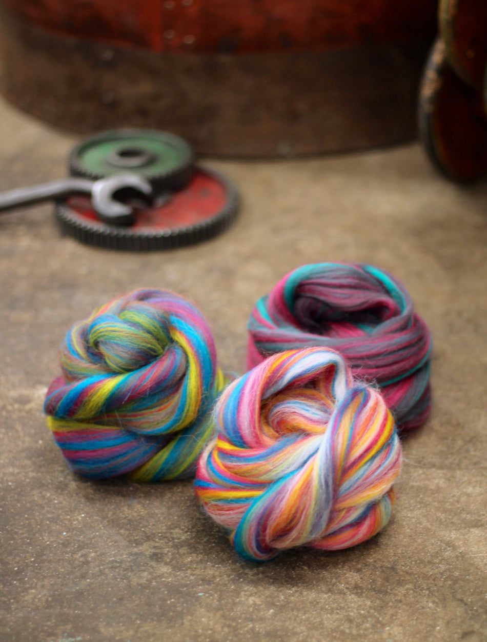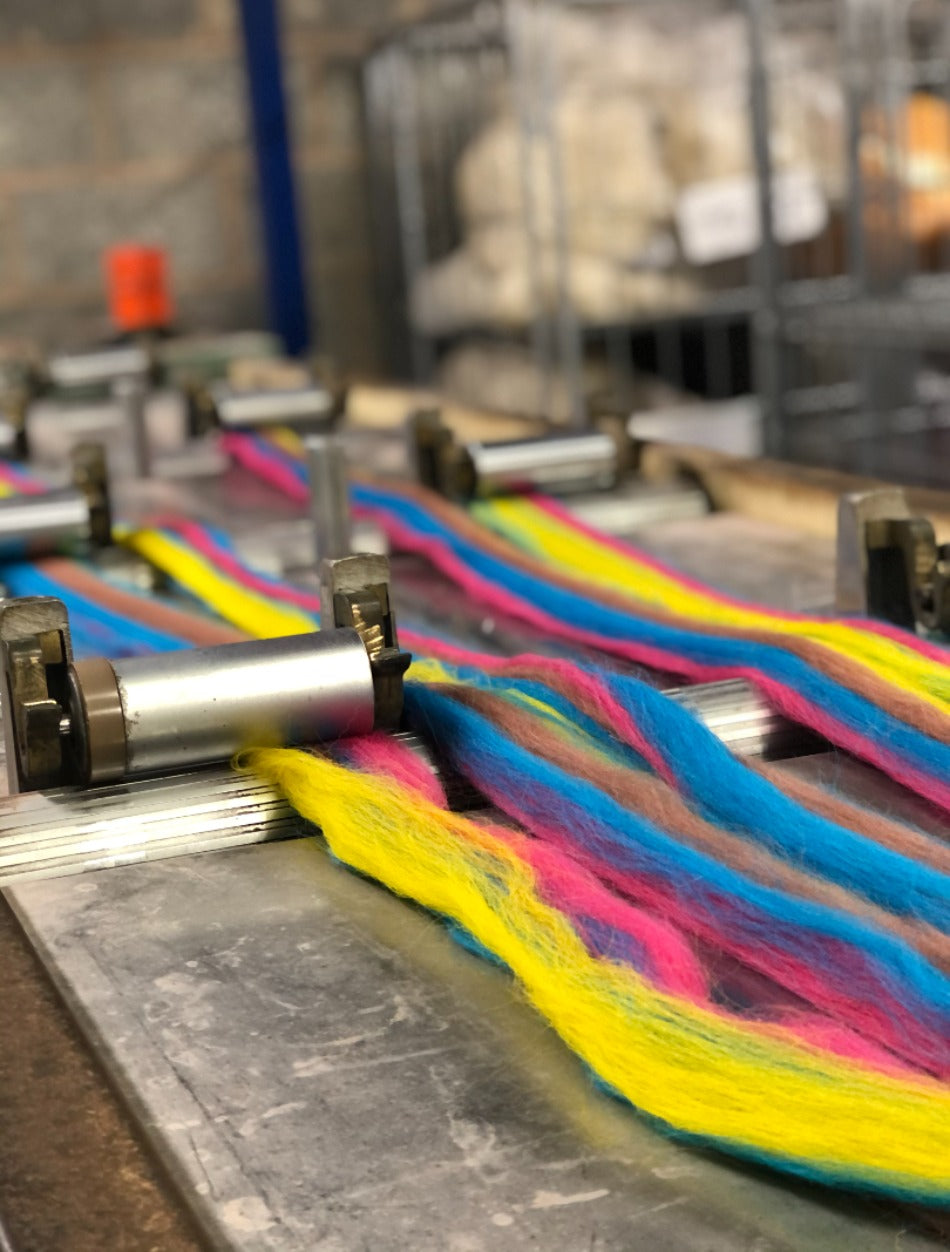 Colour Blending: We start with solid coloured tops (aligned fibre) and blend them together using precise recipes to create our nuanced shades.