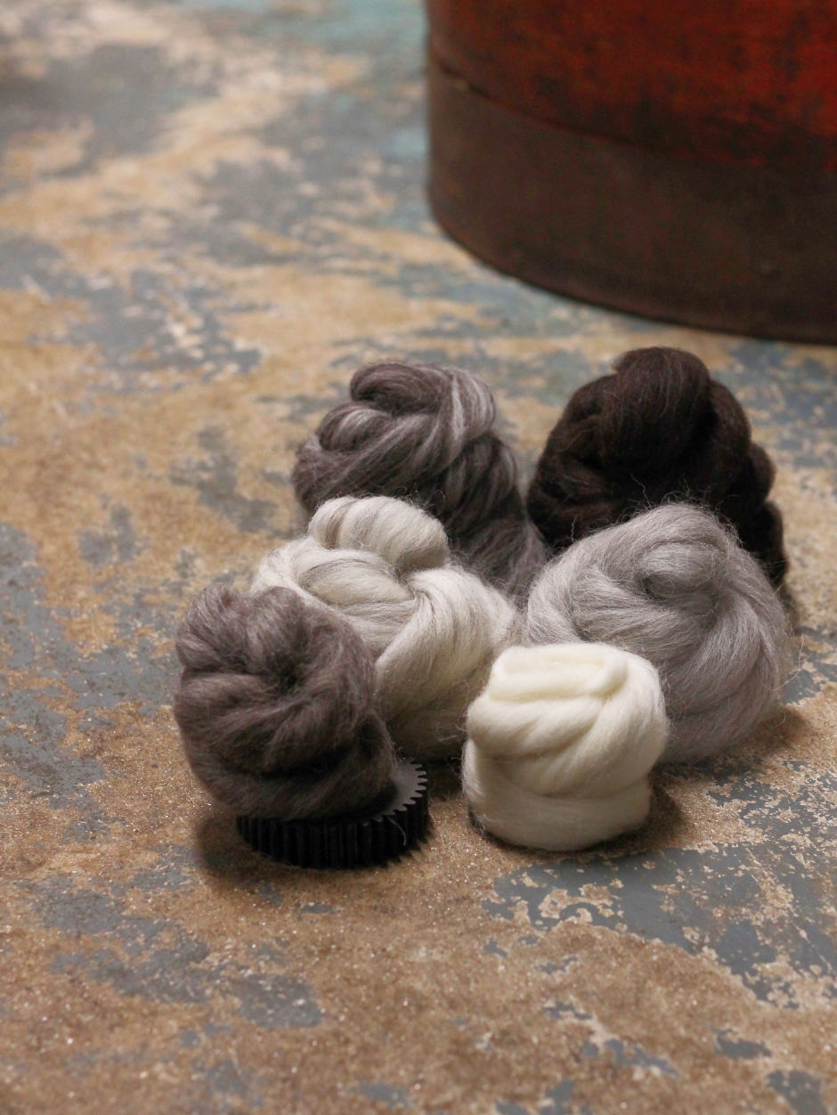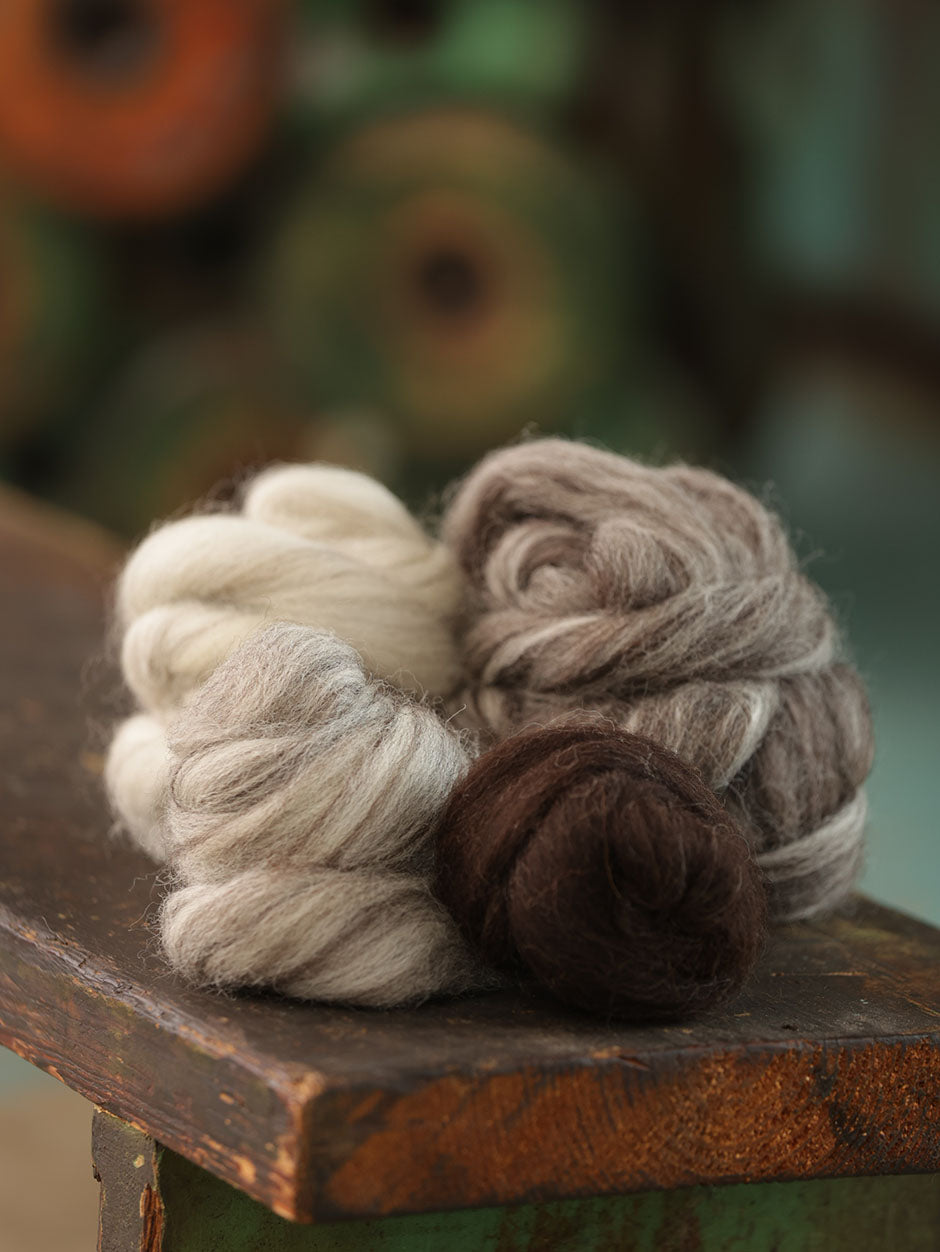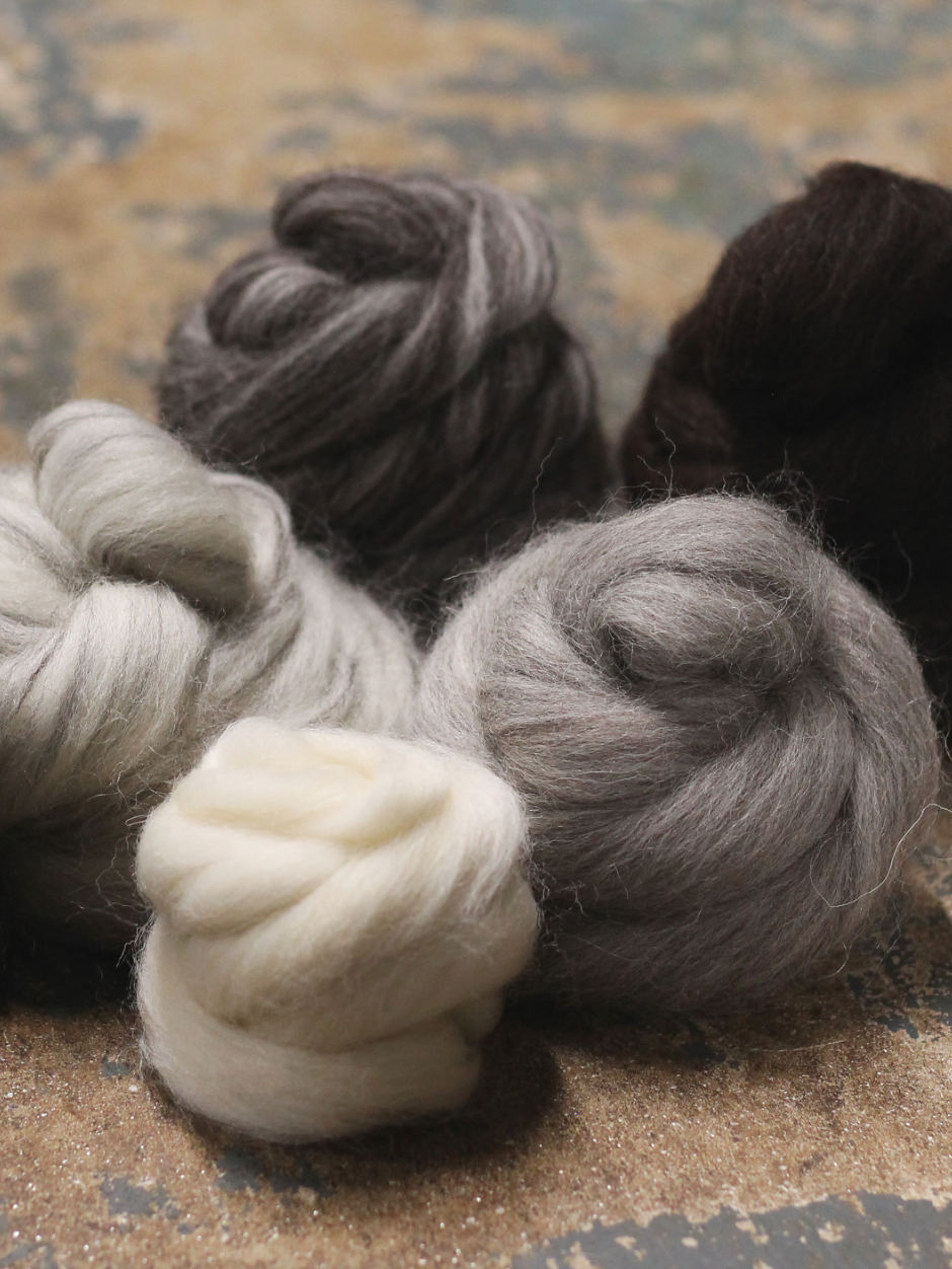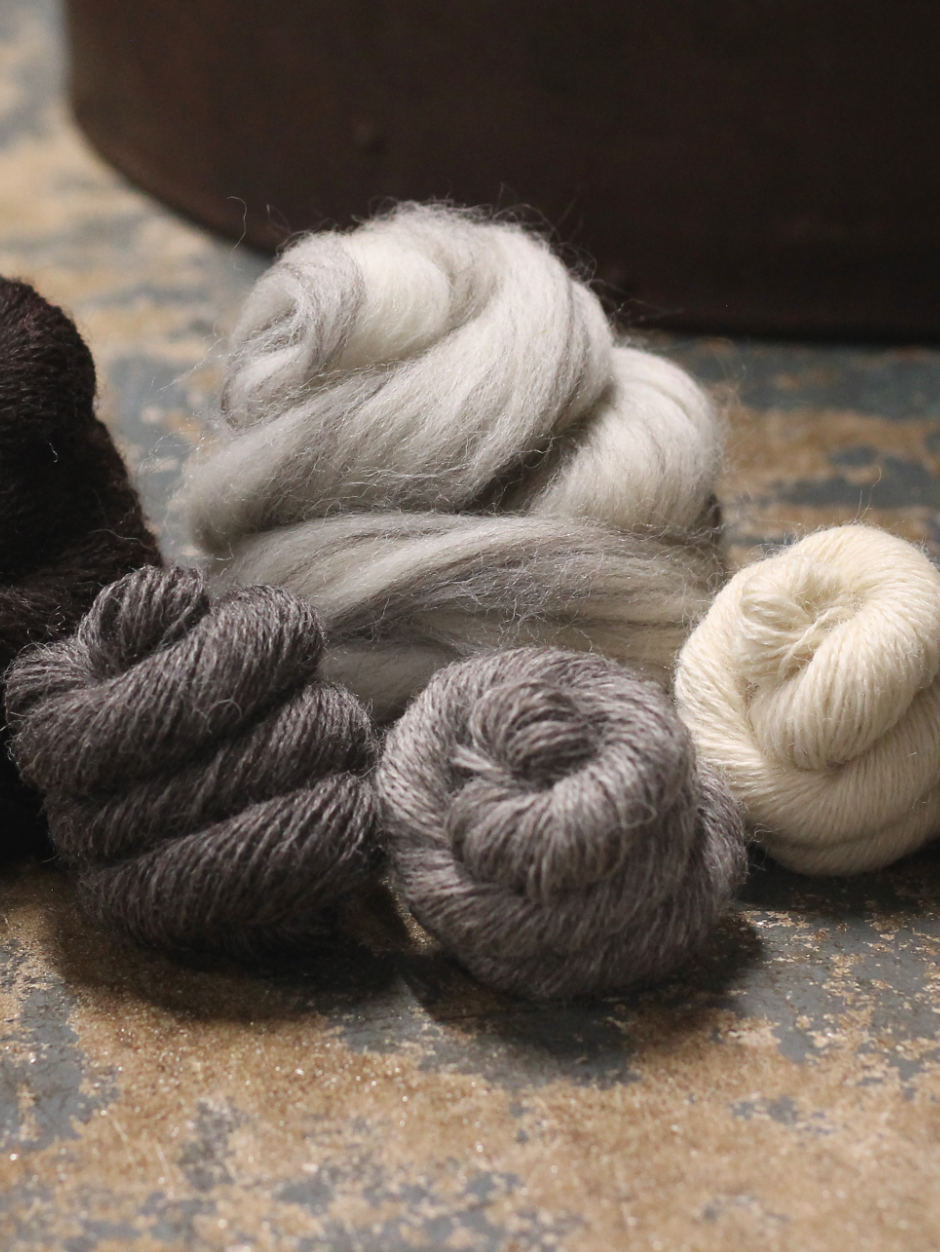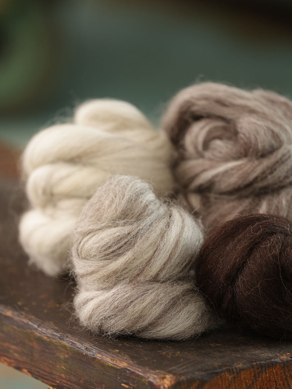 Each blend leans into a different characteristic of the wools – the Zwartbles / Exmoor Blueface is super bouncy and robust, and the Grey Exmoor Blueface / Romney is softer and more lustrous. We hope that these lovely sheepy tops will suit a variety of projects and help you find the right blend for your heirloom pieces.
