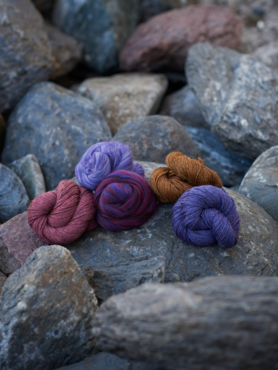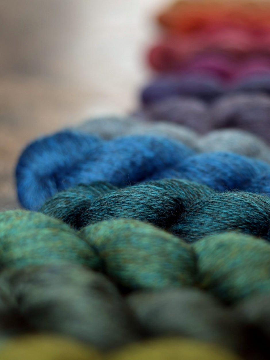Colour Blending: We start with solid coloured tops (aligned fibre) and blend our nuanced, heathered shades using precise recipes. If you look closely at any of our yarns, you’ll see that each heathered shade contains a multitude of colours within it.