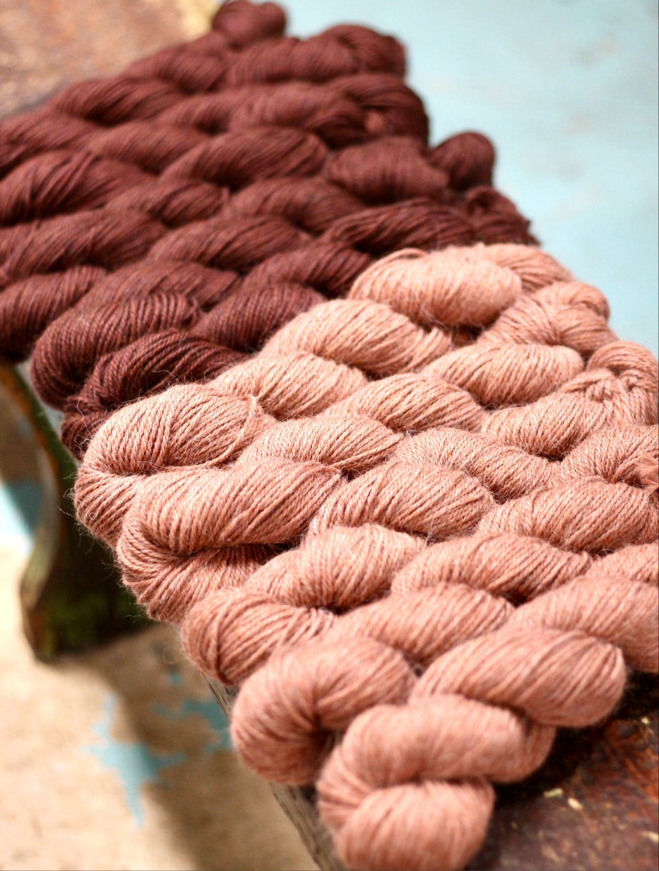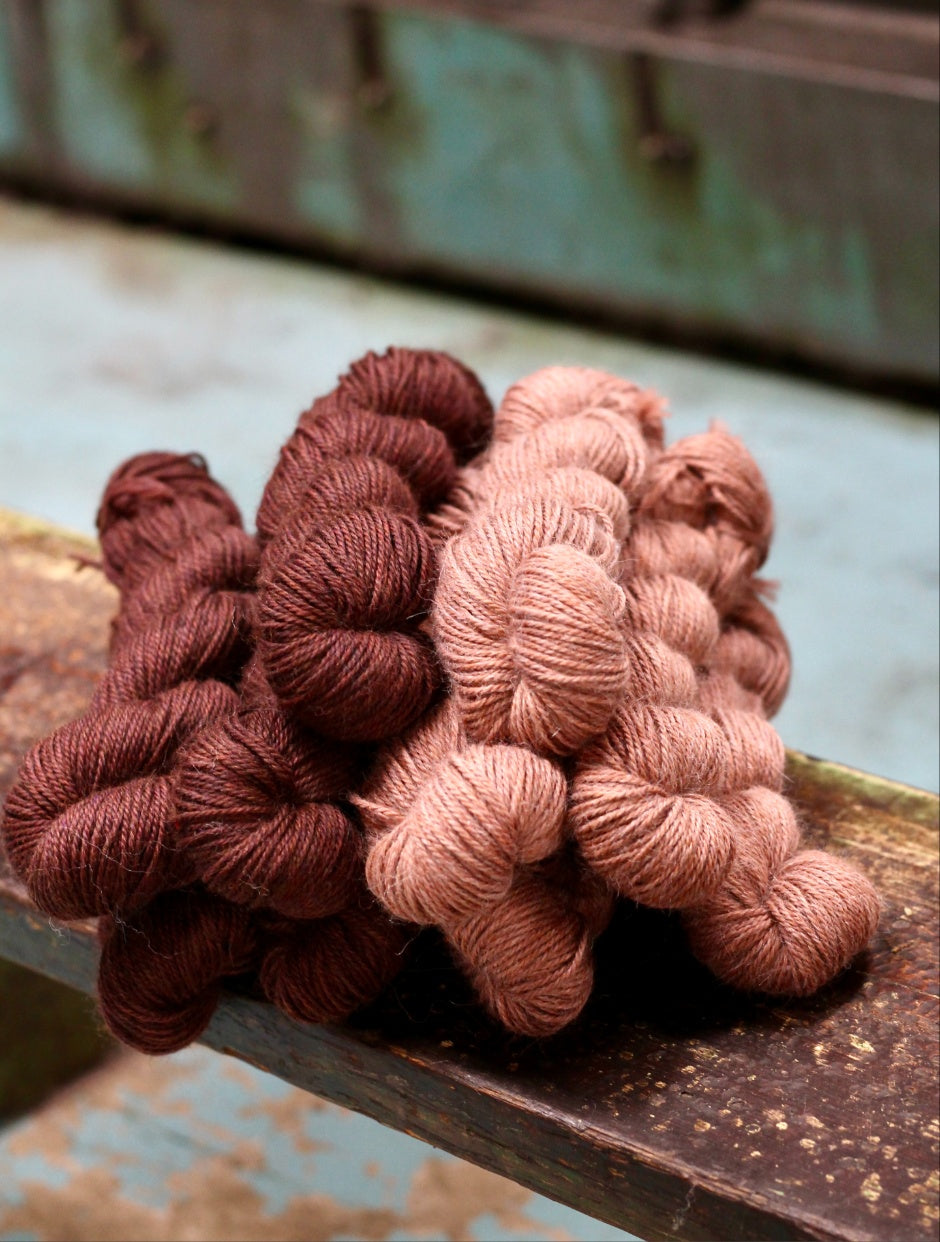 Squish ‘Light’ and ‘Dark’ are two fabulously complimentary shades that work fantastically together (we can’t wait to see them in a colourwork project!) Those pops of colour against the natural shades of alpaca, create a lovely brown and warm pink hue that brings to mind cosy times inside next to a fire. Heaven!