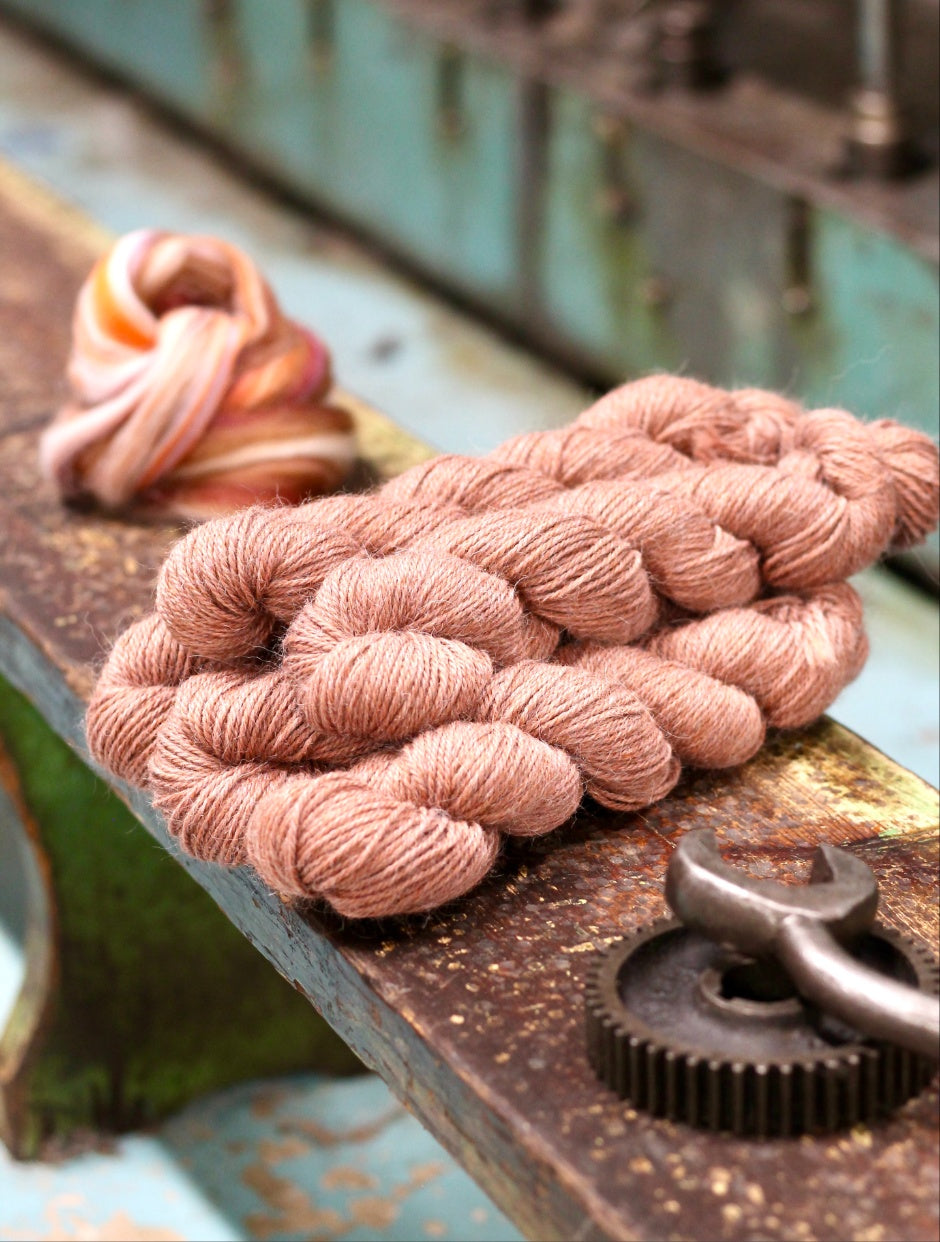 Colour Blending: We start with solid coloured tops (aligned fibre) and blend our nuanced, heathered shades using precise recipes. If you look closely at any of our yarns, you’ll see that each heathered shade contains a multitude of colours within it.