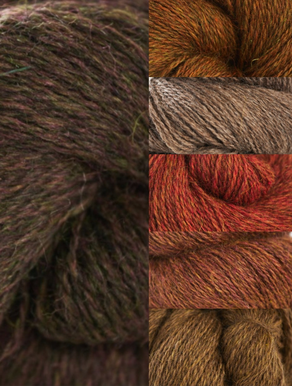 - 8x Harvest Hues Worsted mini skeins (25g each) in Russet (2x), Barley (2x), Medlar (2x), Bracken (1x) and Flax (1x)