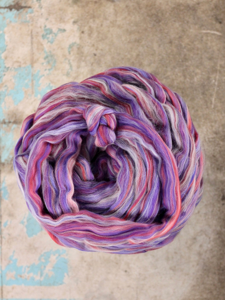 Season of the Witch is a classic witchy purple blended out of Merino, Bluefaced Leicester, Exmoor Blueface and a dash of Romney. The gloriously punchy purple is complemented with bits of poppy red and slivers of grey. It's super soft thanks to its high Merino content, but still sturdy - just like a true witch - due to the addition of the Bluefaced Leicester and Exmoor Blueface. The dash of Romney adds a little bit of lustre, just like a bit of moonshine on a witch's hat!