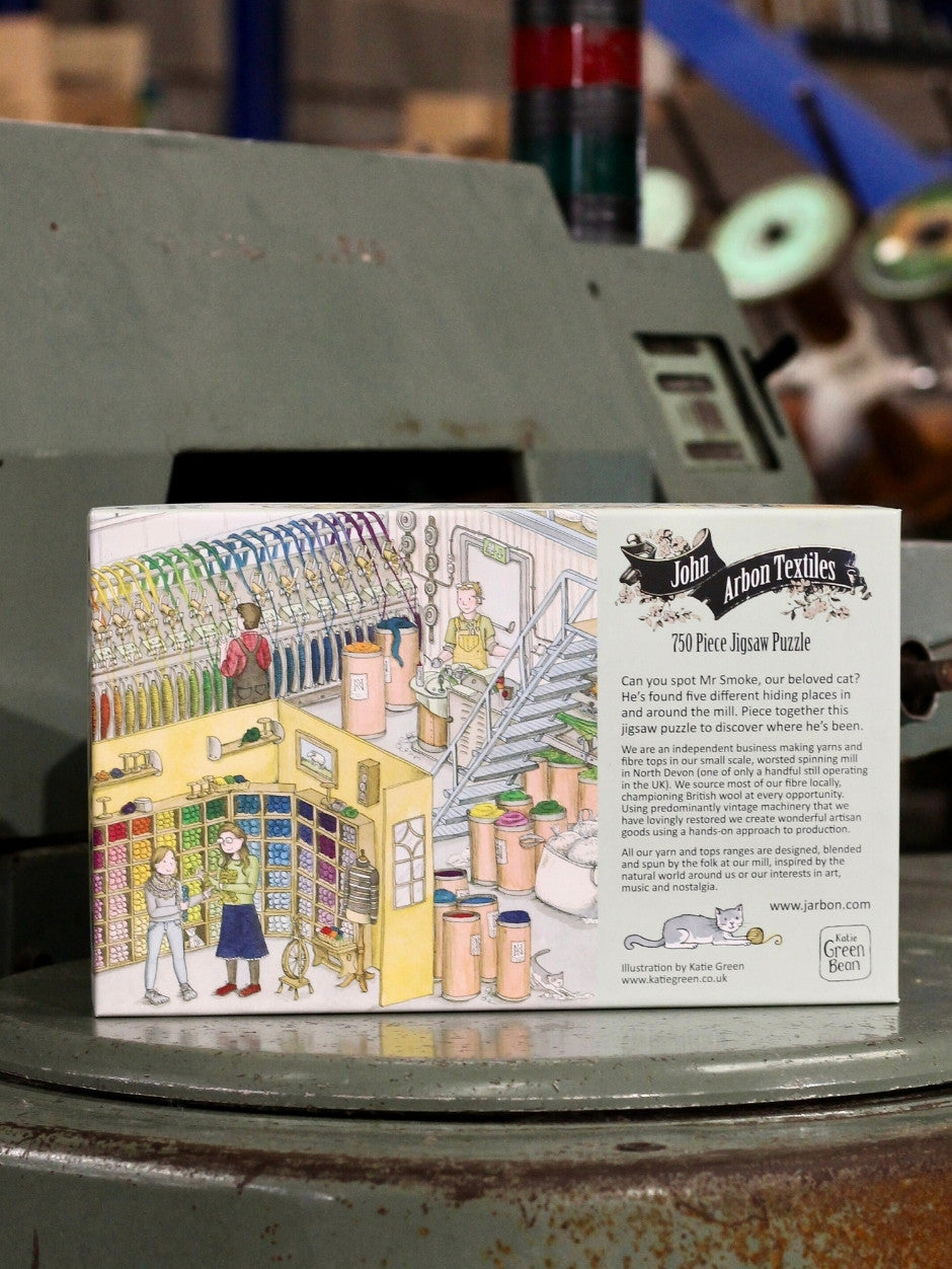 Enter Katie Green's stunning illustration "Spot Mr. Smoke" from The Annual (issue one) – a delightful depiction of our mill, including a little glimpse at our showroom, and of course Mr. Smoke, John and Juliet's beloved old cat, who's hiding in the midst of the creative woolly chaos that is a day at the mill! This puzzle is one half of Katie's brilliant "Spot Mr. Smoke" illustration. Keep an eye out for the second half at some point down the line.