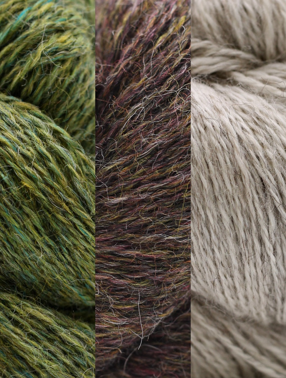 - 6x Mineralogy 4ply full skeins (100g each) in Moss Agate (2x), Bog Oak (2x) and Alabaster (2x)
